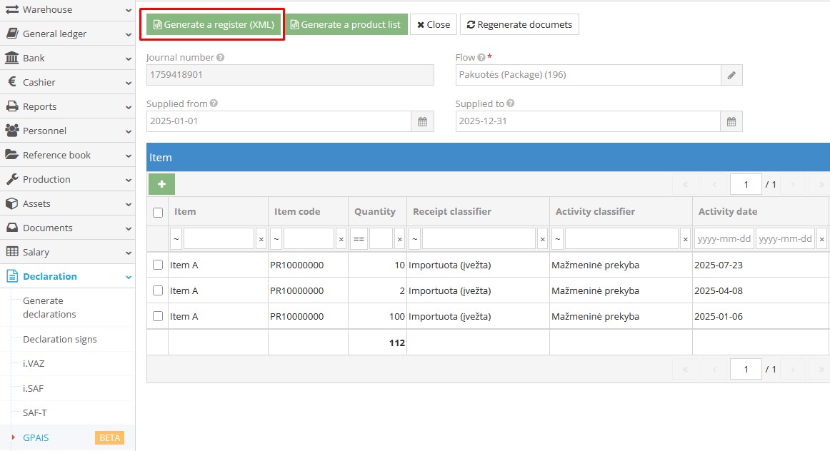 Formation of the GPAIS Journal (Accounting journal for products, packaging, and waste) in .xml format