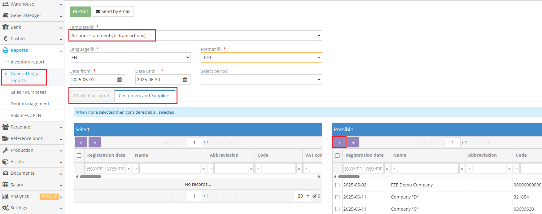 2. Choose whether to generate the report based on specific Chart of Accounts or Customers and Suppliers.