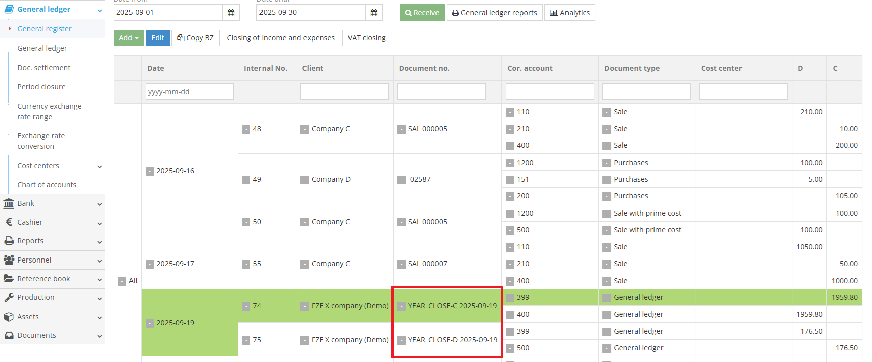 After performing these steps, two main entries will be created in the General register – a credit and a debit transaction. The entry names will be YEAR_CLOSE-C (date) and YEAR_CLOSE-D (date). The created entries will be closed with an interim account.