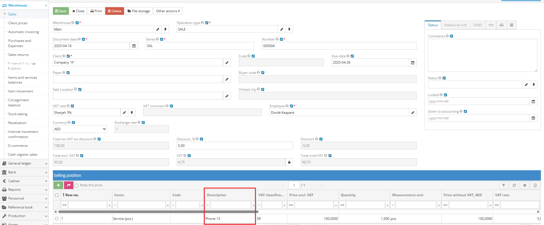 In the module "Warehouse" → "Sales," use the same item card, but adjust the name in the "Description" field.