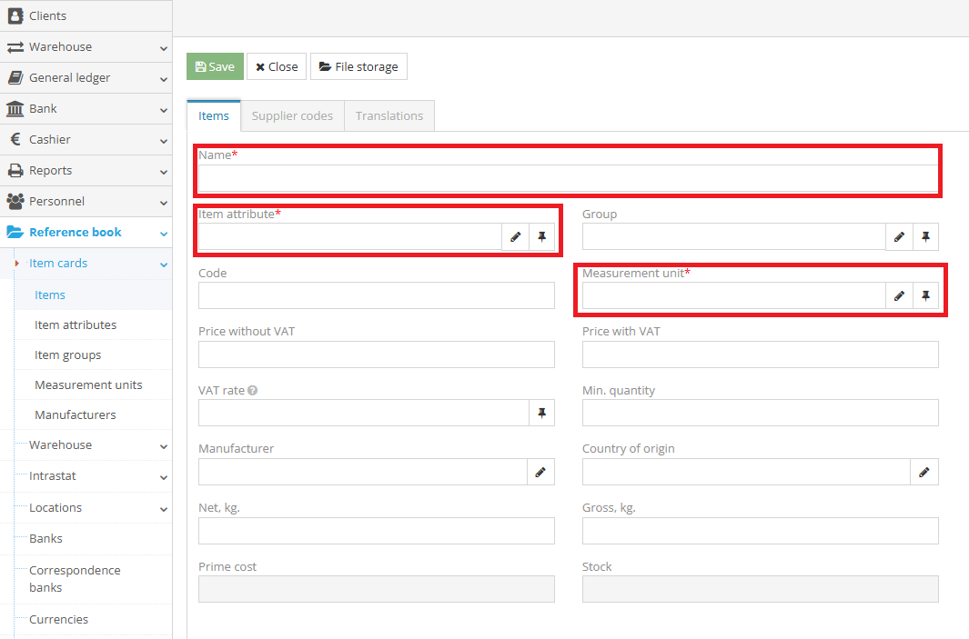 In the "Product" window that opens, fill in the mandatory fields: "Item name", "Item attribute", and "Measurement unit":