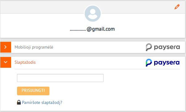 Atlikus nustatymus 1 žingsnyje, programa nukels į „Paysera“ banko sistemą. Užpildykite prisijungimo lauką ir spauskite mygtuką ,,Prisijungti“.