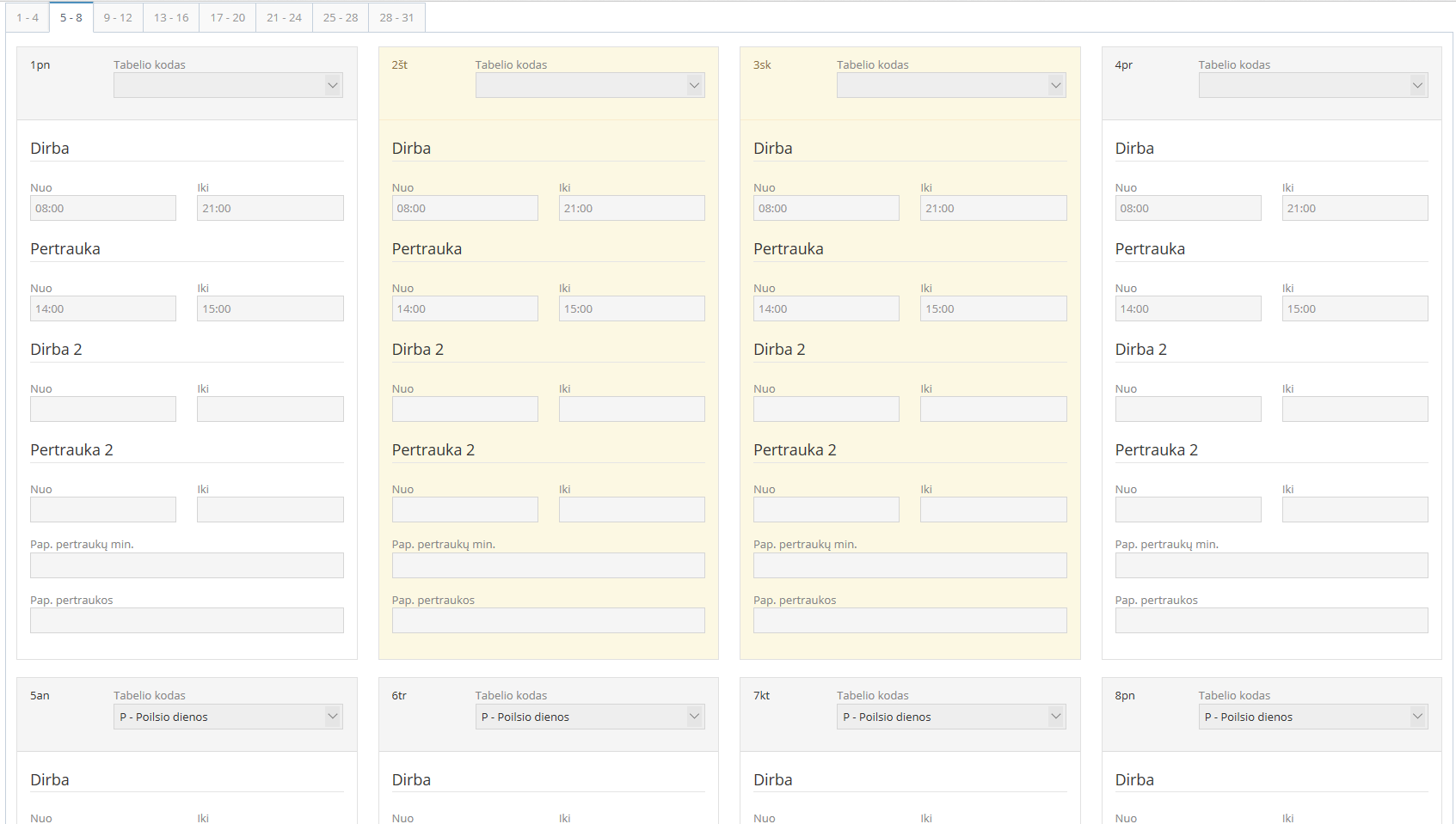 ir lentelėje apačioje atsiras užpildytas darbuotojo darbo grafikas.