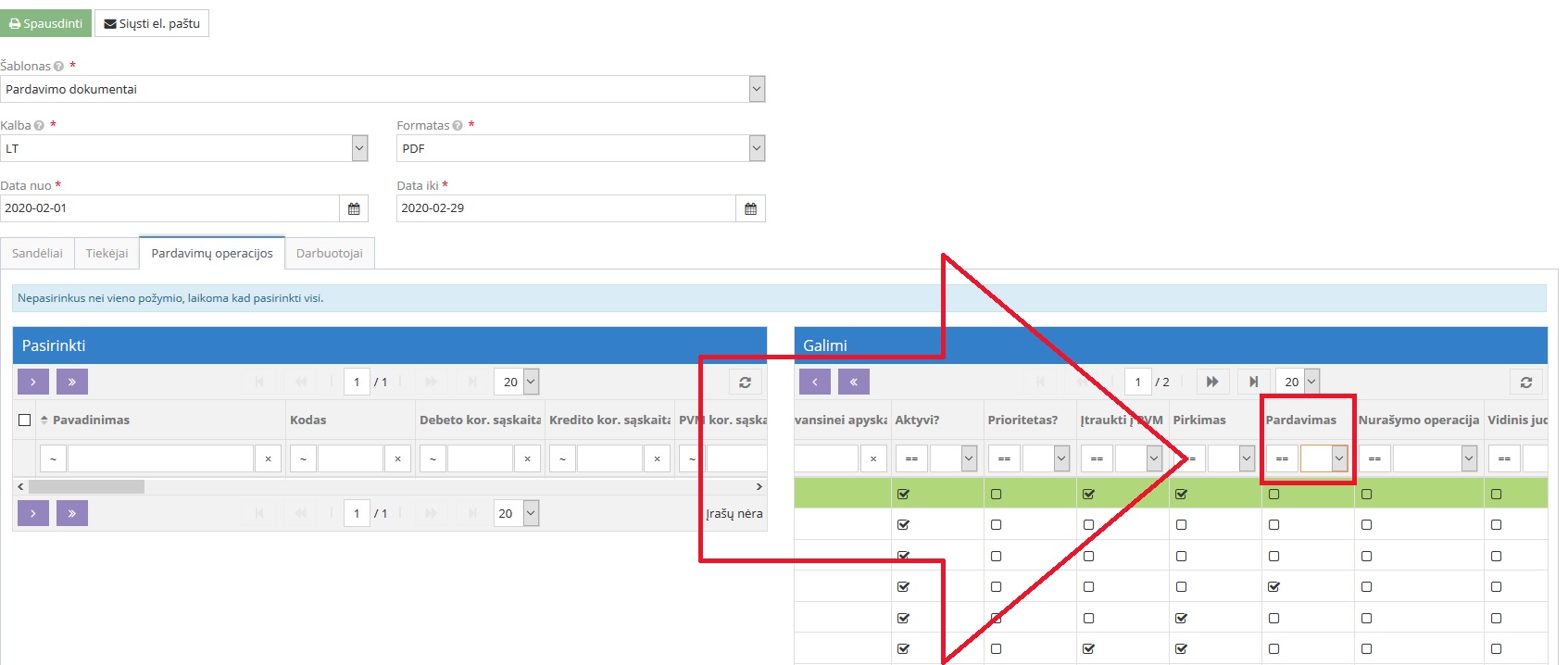 Galima pasirinkti visas reikiamas operacijos rūšis. Paveiksliuke matosi kaip reikia padaryti, kad surinkti visas. Pardavimas stulpelyje pasirinkite „Taip“.