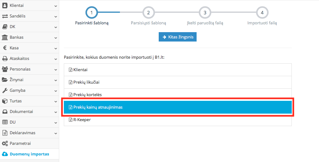 Modulyje pasirinkite „Prekių kainų atnaujinimas”, pažymėkite ir spauskite ant rodyklės ,,Kitas žingsnis”.
