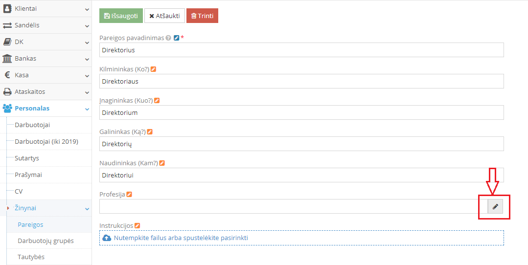Pareigoms reikia priskirti profesijos kodą, tai galite padaryti šiame modulyje. Sukurkite naujas pareigas arba atidarykite jau sukurtas pareigos kortelę, kortelės viduje „Profesija” paspauskite ant pieštuko ir parinkite kodą priklausantį šiai profesijai. Pasirinkus profesiją informaciją išsaugokite ir patikrinkite ar prie pareigų matosi profesijos kodas.
