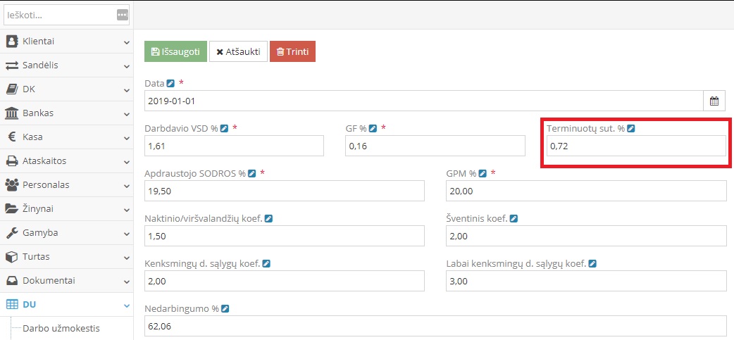 Nurodykite terminuotos darbo sutarties procentą laukelyje „Terminuotų sutarčių %“.