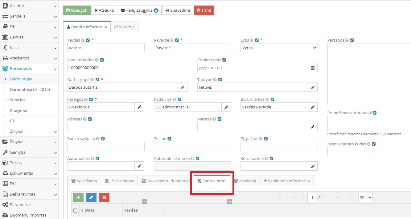Darbuotojo kortelėje laukelyje „Sodros proc.“ paspauskite - „Sukurti naują įrašą“. Atsidariusiame lange nurodykite datą nuo kada priskiriate naują Sodros procentą ir „Tarifas“ laukelyje įrašykite naują sodros procentą ir išsaugokite.