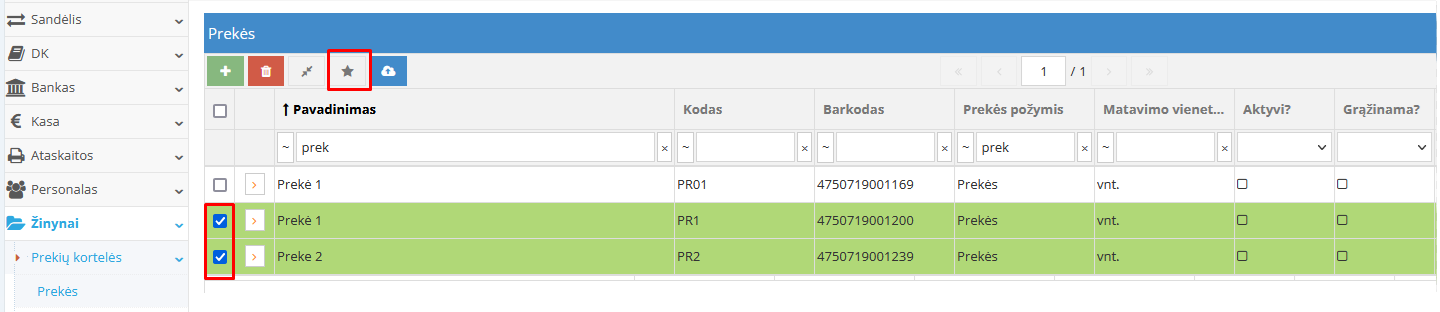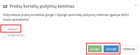 pažymėti varnele ant "Aktyvi?" spausti "Įjungti", kad pasirinktoms prekių kortelėms požymis „Aktyvi?“ būtų uždėtas.