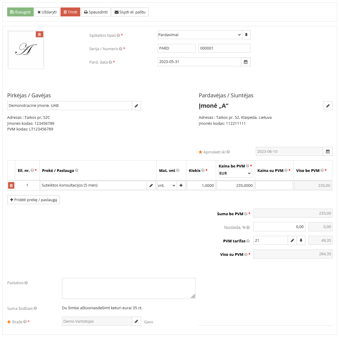 • pardavimo sąskaitos išrašymas, kokia instrukcija