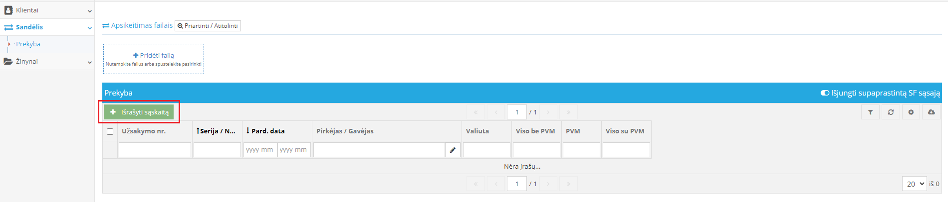 Norėdami išrašyti sąskaitą, nueikite į modulį „Prekyba“ ir spauskite žalią mygtuką „+“ (sukurti naują įrašą).