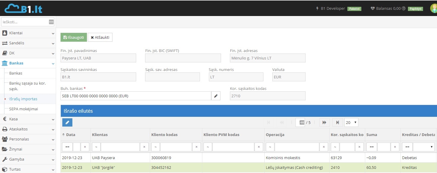 Pastaba: Jei banko išraše nėra perduodamos įmonės kodo, o kliento pavadinimas neatitinka banko perduodamo kliento pavadinimo, tai sukuriamas naujas klientas. Tačiau, jei klientui įrašyta atsiskaitomoji sąskaita, tai paieška vykdoma ir pagal atsiskaitomąją sąskaitą.