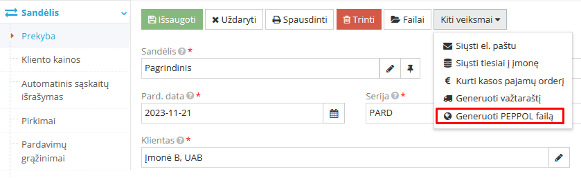 2. Spausti „Kiti veiksmai“ → Generuoti PEPPOL failą