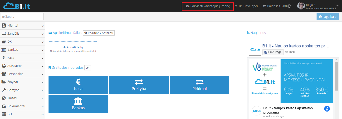 Administracinėje panelėje viršuje spauskite mygtuką „Pakviesti vartotojus į įmonę“.