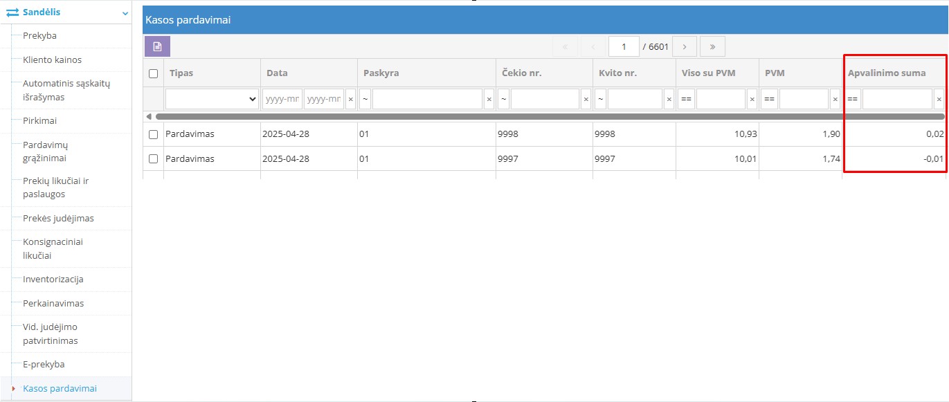 3. Modulyje Sandėlis → Kasos pardavimai rodomas naujas tulpelis „Apvalinimo suma“, kuriame pateikiama informacija apie pritaikytą apvalinimą.