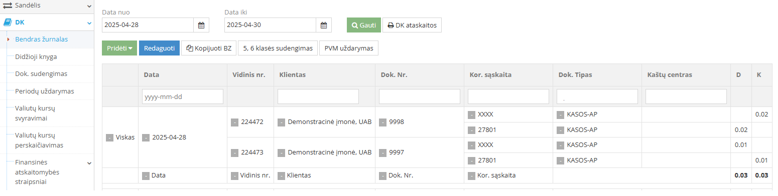 4. Automatiškai pagal kvito numerį atliekamas įrašas DK → Bendrasis žurnalas modulyje