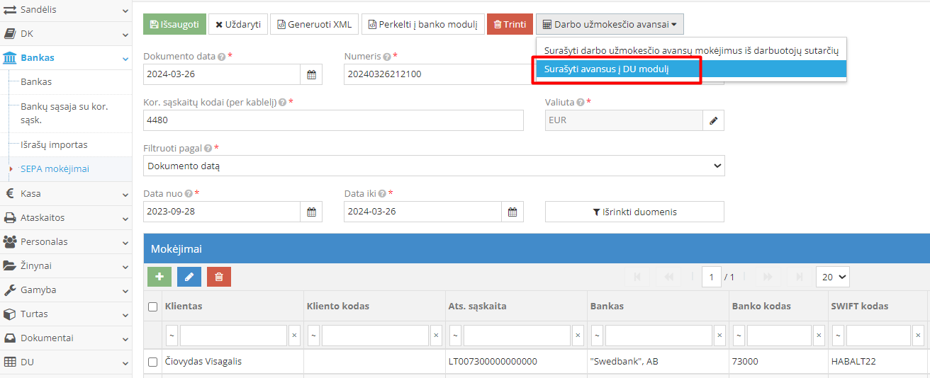 5. Suformuotų avansų perkėlimas iš SEPA mokėjimai į DU priskaitymo langą