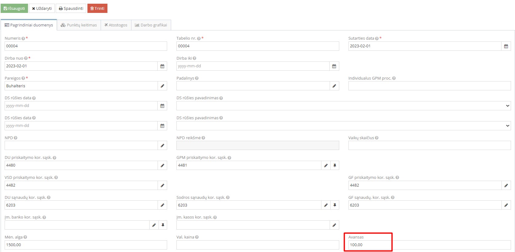 • jei užpildytas darbuotojo sutartyje laukelis „Avansas“;