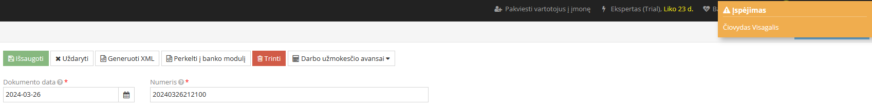 Pastaba. Surašymas gali nepavykti jei nėra sukurtas įrašas DU → Darbo užmokestis. Sukurti darbo užmokesčio priskaitymo įrašą spaudžiant „+“, įrašo mėnuo turi sutapti su SEPA mokėjimo įrašo mėnesiu.