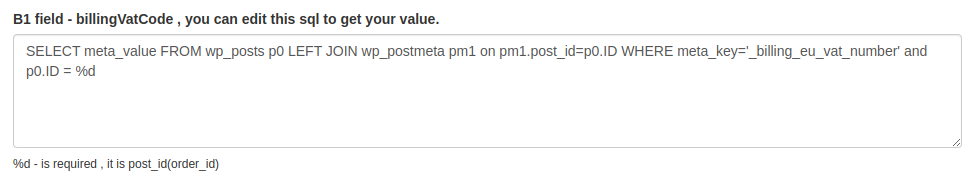 El. parduotuvės Site.pro įskiepio nustatymų lange "Field mapping" reikia susirasti lauką "billingVatCode", jame įvesti SQL sakinį, nurodantį iš kur duomenų bazėje paimti duotam užsakymui kliento PVM kodą ir išsaugoti.