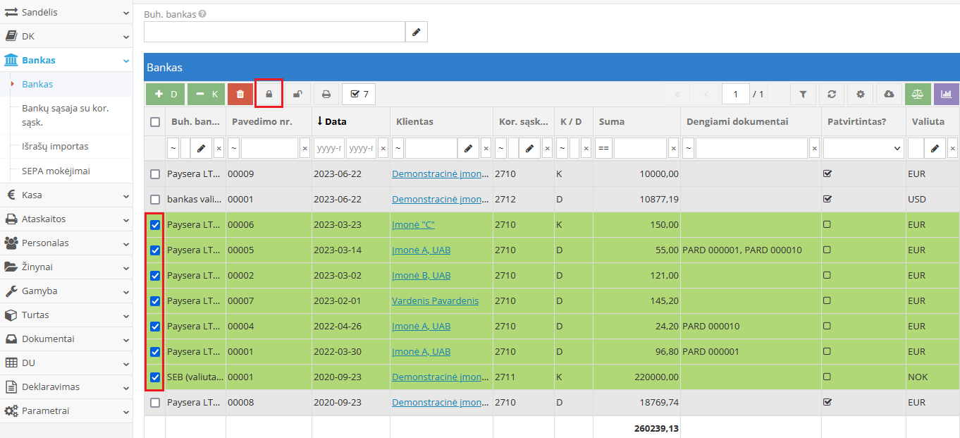 Pažymėkite įrašus, kuriuos norite patvirtinti varnelėmis, tie įrašai pasidaro žali, tada spauskite mygtuką spyna „Užrakintas“. Patvirtinti įrašai pasidaro pilki.