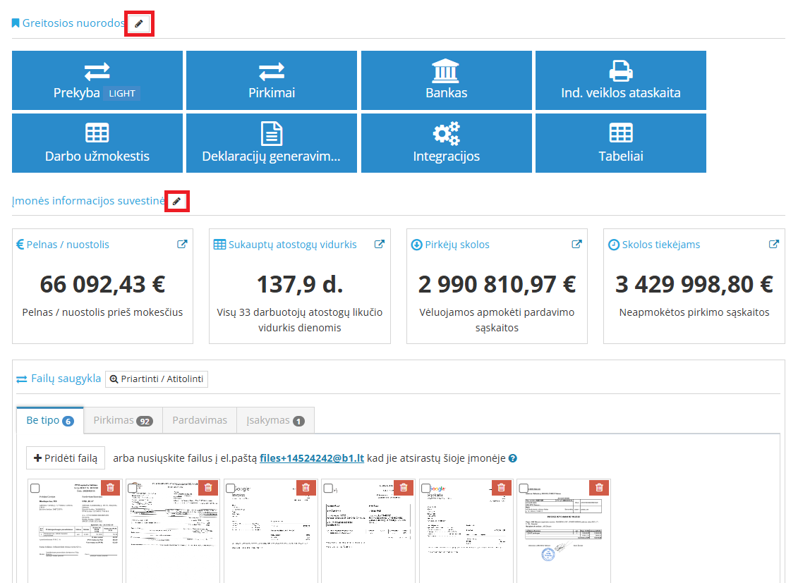 Greitąsias nuorodas ir įmonės informacijos suvestinę kiekvienas vartotojas gali personalizuoti rankiniu būdu, spustelėdamas ant pieštuko.