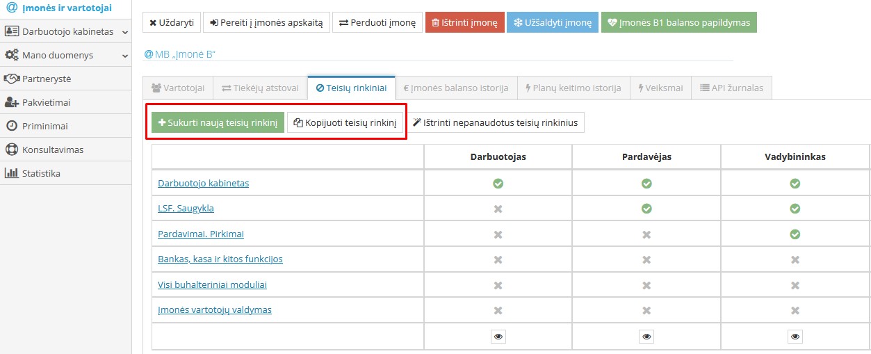4.3 Norint sukurti naują teisių rinkinį – skiltyje „Teisių rinkiniai“ pasirinkti „Kopijuoti teisių rinkinį“, pasirinkti esamą rinkinį ir įmonę, kurioje jis bus išsaugotas;