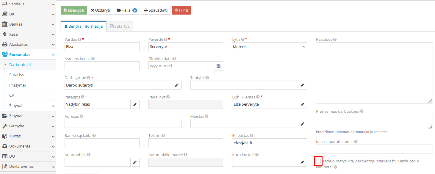 Norint suteikti darbuotojui teisę matyti savo „Darbuotojo kabinete“ kitų darbuotojų tvarkaraštį, reikia įjungti šios informacijos rodymą darbuotojo kortelėje.