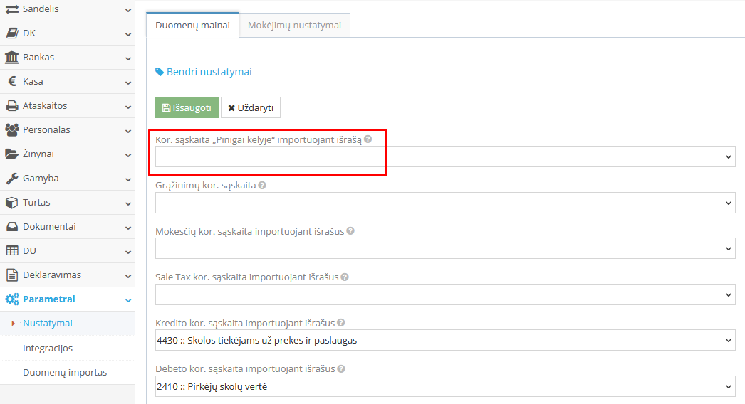 Parametrai → Nustatymai → Duomenų mainai