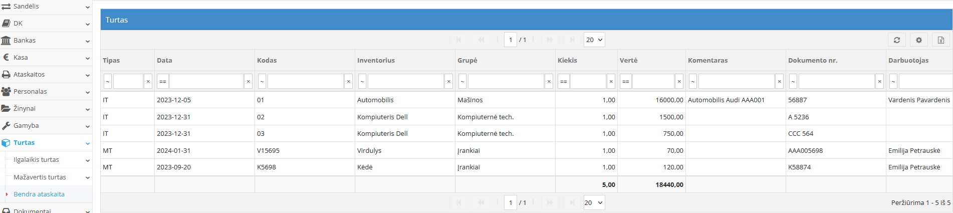Ataskaitoje pateikiamas visas įmonėje naudojamas turtas: ilgalaikis ir trumpalaikis, kurį galima filtruoti turtą pagal sumas, tipą, datą, grupes ir kitus požymius.