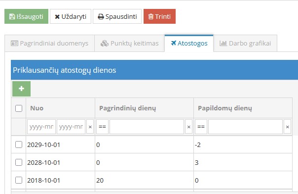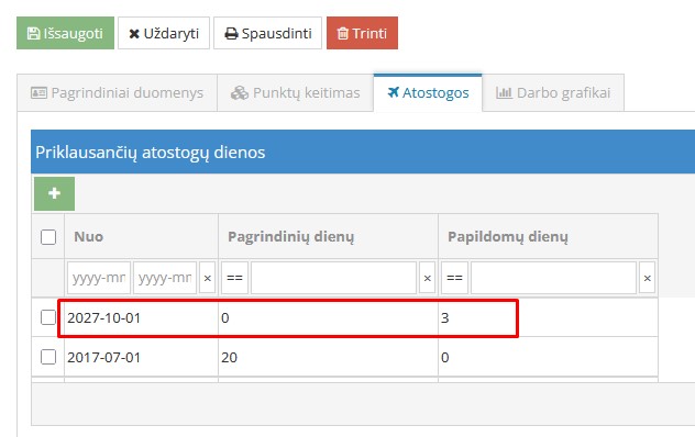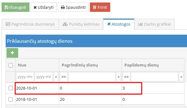 papildomos atostogos (t.y. dienų skaičius 3d.) priklauso nuo datos 2028-10-01 (sistema skaičiuoja visas dienas įrašytas lentelėje, tai yra su pliusu – sumuoja, su minusu – minusuoja).