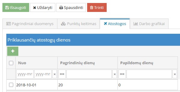 2. Prie darbuotojo darbo sutarties tabe „Atostogos” įvesti atostogų dienų skaičių spaudžiant mygtuką „+“:
