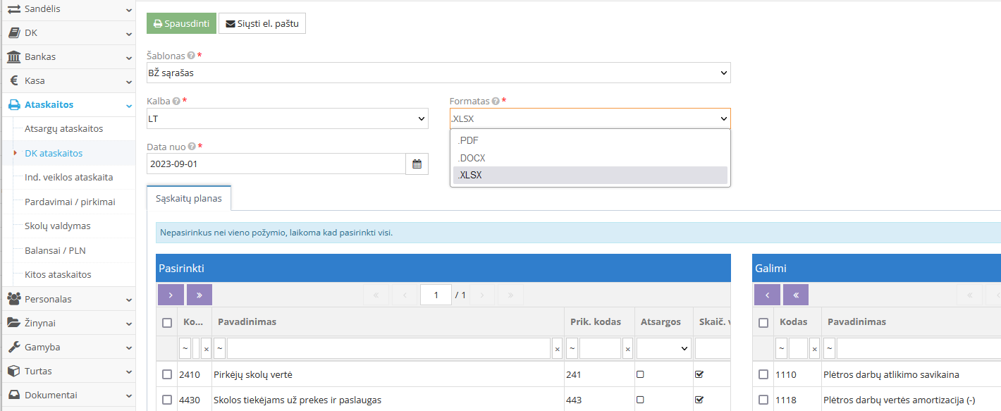 Pastaba. Ataskaitą formuoti galima .PDF .DOC .XLSX formatais.