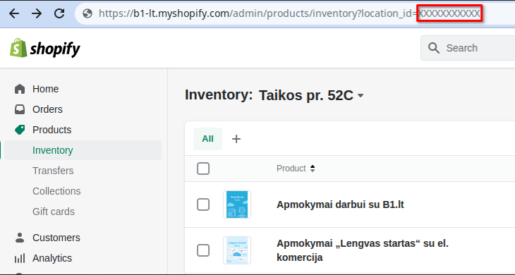 Shopify lokacijos ID – galima pamatyti Shopify parduotuvės naršyklės adreso eilutėje, administravime pasirinkus Products → Inventory