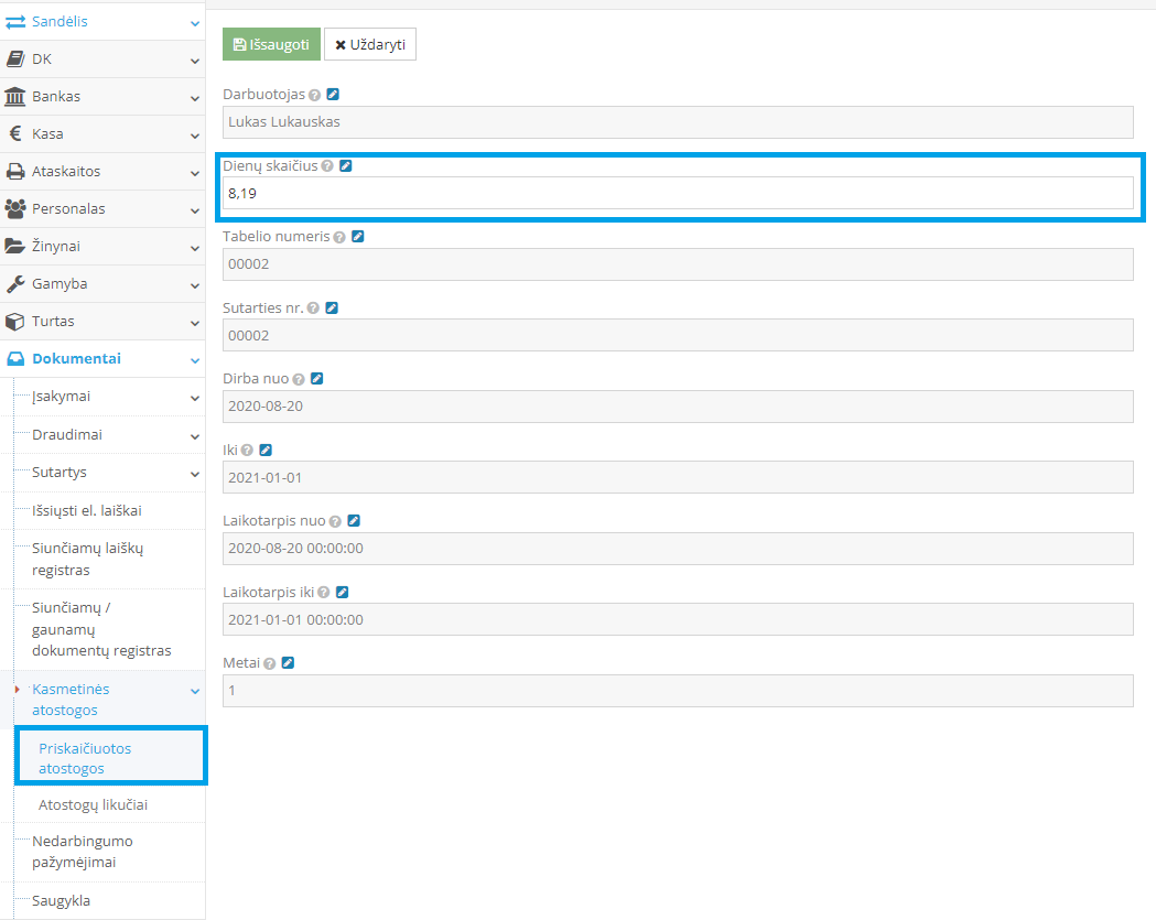 • redagavimo forma, kurioje būtų priskaičiuotos atostogos.