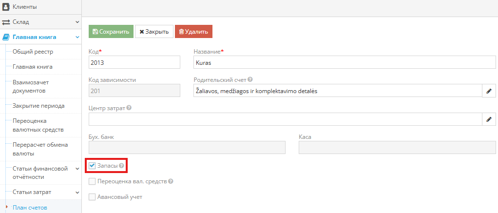 1. При покупке товаров или топлива проверьте, установлена ли галочка в плане счетов на корреспондирующем счете материалов (20XX) напротив «Запасы».
