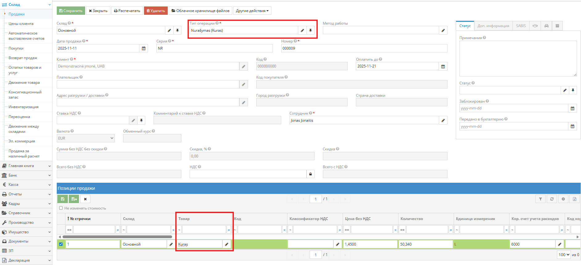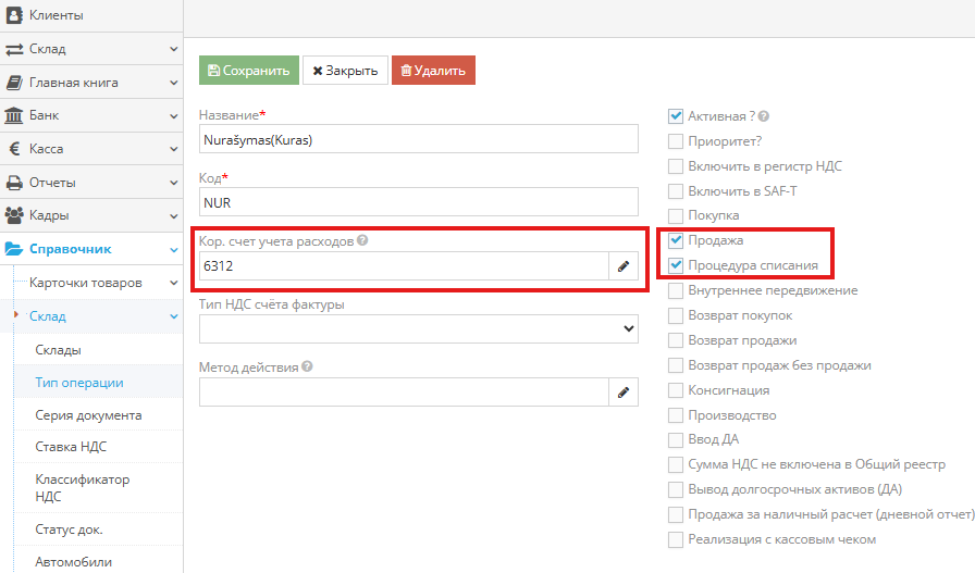 Справочники → Склад → Виды операций