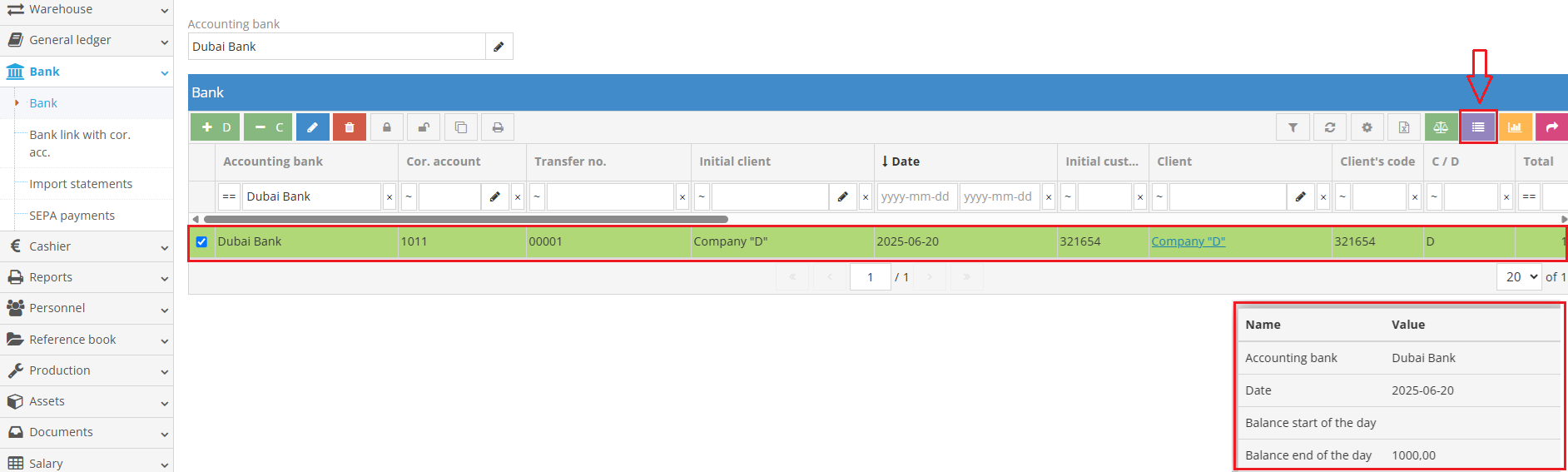 Выберите запись за дату, по которой хотите увидеть баланс, и нажмите кнопку "Баланс банка".