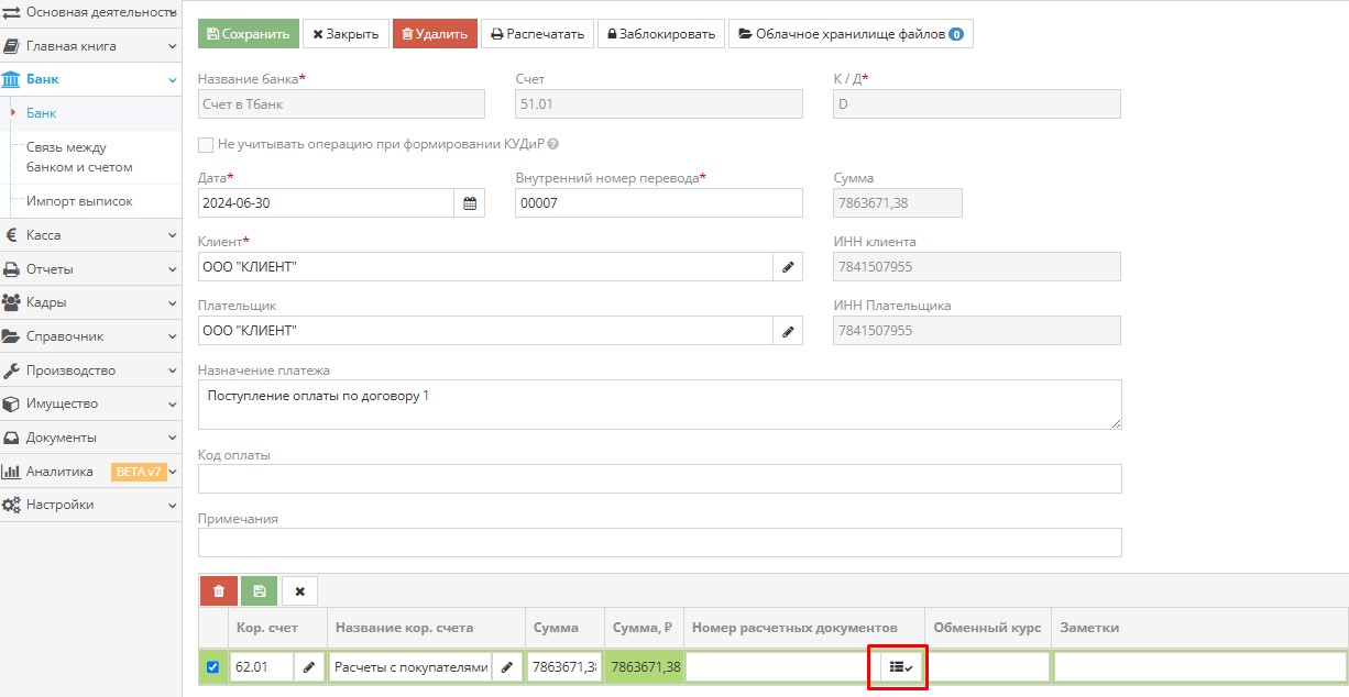 Откройте уже созданную операцию по получению/списанию денежных средств или создайте новую. В нижней части позиции в графе «Номера расчетных документов» нажмите черную кнопку.