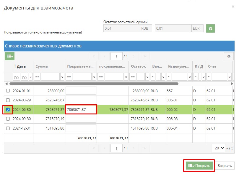 Чтобы выбрать документ, который необходимо охватить, выберите записи. После выбора записи в столбце «Покрытая сумма» должна появиться покрытая сумма. После выбора записей нажмите кнопку «Покрыть».