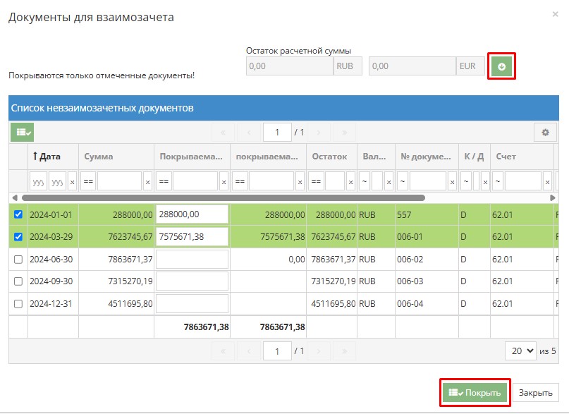2. Если вы сначала ввели сумму в поле «Сумма» и только потом нажали кнопку «Номер защищаемого документа», затем вы можете покрыть счета, нажав кнопку «Остаток расчетной суммы» и нажав на зеленую стрелку. Документы будут обработаны последовательно сверху вниз на указанную сумму.