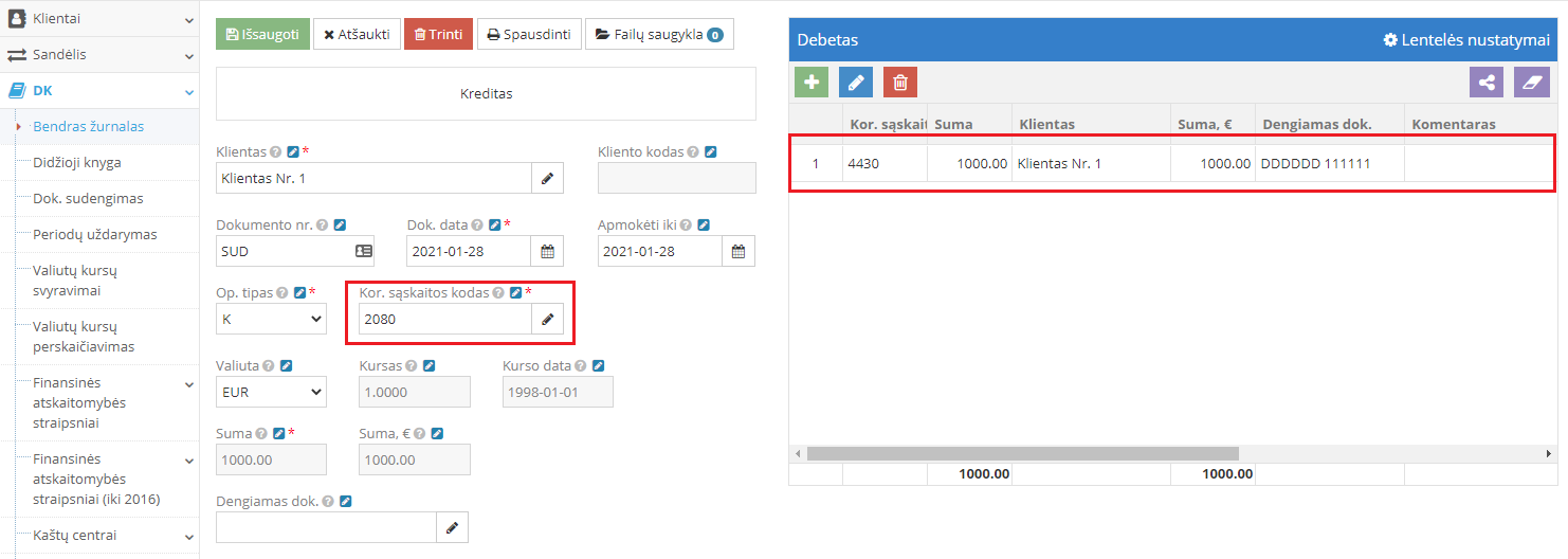 2. Выберите проводку Дебет или Кредит, откроется карточка DK. Если выбрать Дебет, то в открывшейся таблице дебетовая операция будет слева, а кредит — справа.